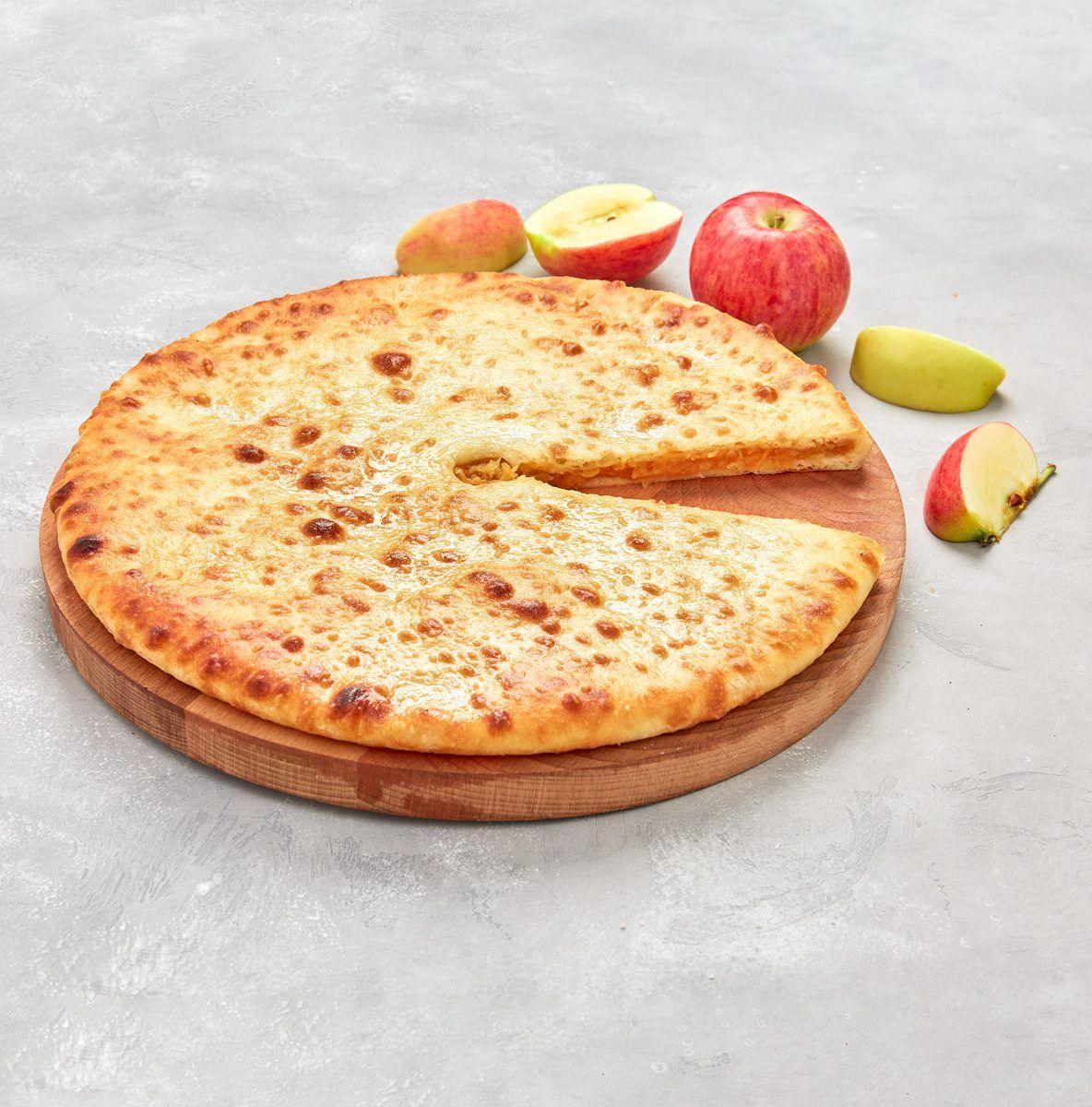 От величественных Кавказских гор — к вашему домашнему очагу. Этот пирог продолжает многовековую традицию осетинской выпечки, где главные священные символы — солнце, земля и вода — воплощаются в форме круглого пирога. Мы бережно сохранили саму душу традиции: ручную лепку и соотношение теста и начинки 30/70, но наполнили её новым, светлым смыслом. Вместо сытной классики — нежная начинка из топлёных яблок с ванилью, которая напоминает о солнечных садах у подножия тех самых гор. Это гимн гостеприимству, поданный в сладком, летнем звучании.